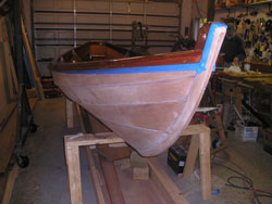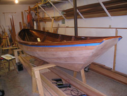 Finished in the fall of 2004 is a 17 foot Swampscott Dory, first designed and built by Fred Dion around 1910. The lines were taken off and presented by John Gardner in his book "The Dory Book". The boat is lapstrake construction of solid African mahogany using the West System. The boat is powered by both sail and electric. |